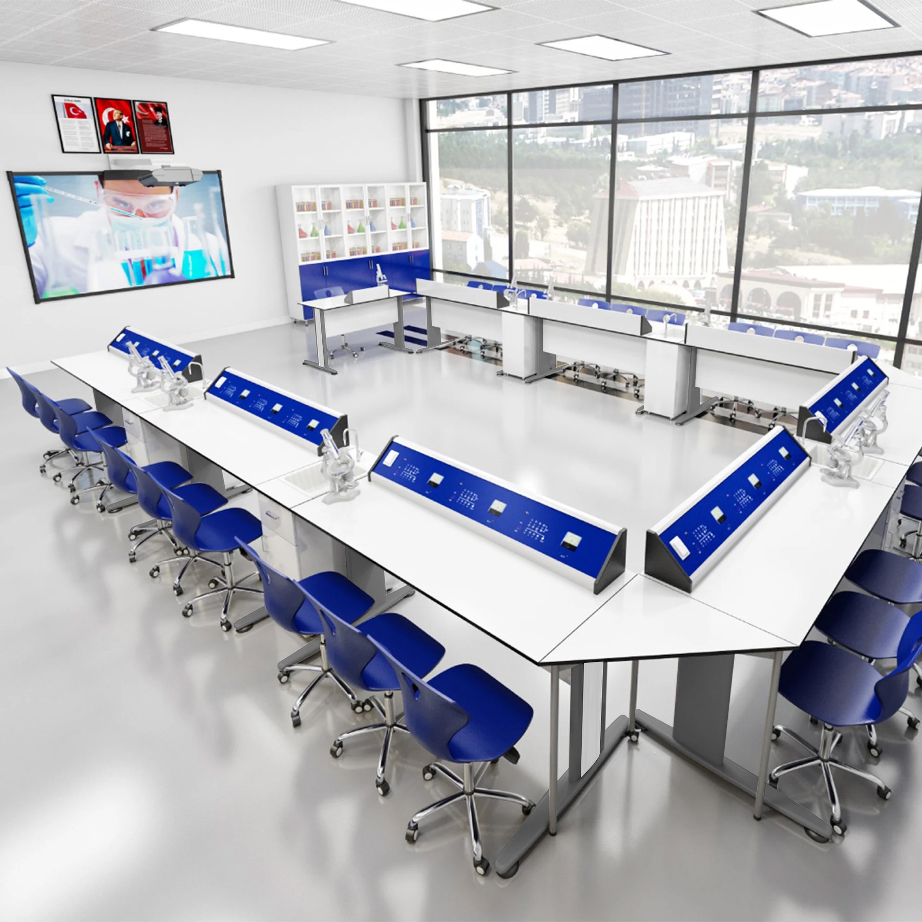 • Има умивалник, захранване, заземен електрически контакт, аналогов амперметър и волтметър. Ученическите работни модули са защитени с предпазител. Всяка маса за експерименти може да се управлява отделно с контролния панел, поставен на масата за учители.