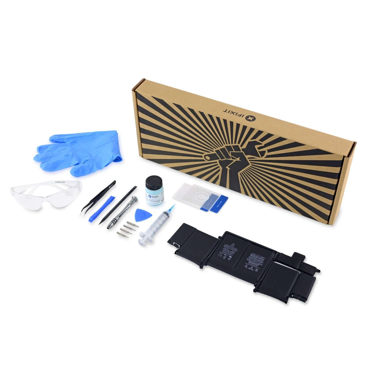 Съдържание на комплекта: - MacBook Pro 13" Retina Display (Early 2015) - лепяща основа за батерията - Kit Bit Driver - iFixit 4 mm Screwdriver Bit Torx T5 - Tweezers / Angled / Pro / ESD - iFixit Opening Tool - iFixit Card (2) - Spudger - Safety Glasses - Opening Pick - Adhesive Remover Dispensing Syringe - Adhesive Remover Solution - Cleaning Wipes - Gloves