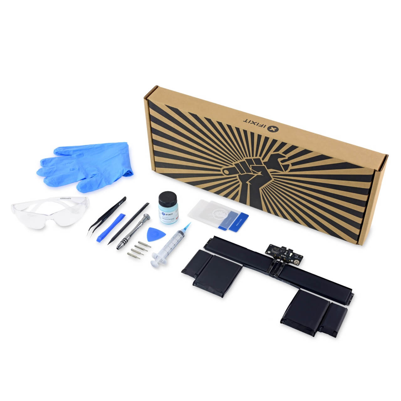 Съдържание на комплекта: - MacBook Pro 13" Retina Display (Late 2012/Early 2013) - лепяща основа за батерията - Installation adhesive - Kit Bit Driver - iFixit 4 mm Screwdriver Bit Torx T5 - iFixit 4 mm Screwdriver Bit Pentalobe P5 - Tweezers / Angled / Pro / ESD - iFixit Opening Tool - iFixit Card (2) - Spudger - Safety Glasses - Opening Pick - Adhesive Remover Dispensing Syringe - Adhesive Remover Solution - Cleaning Wipes - Gloves