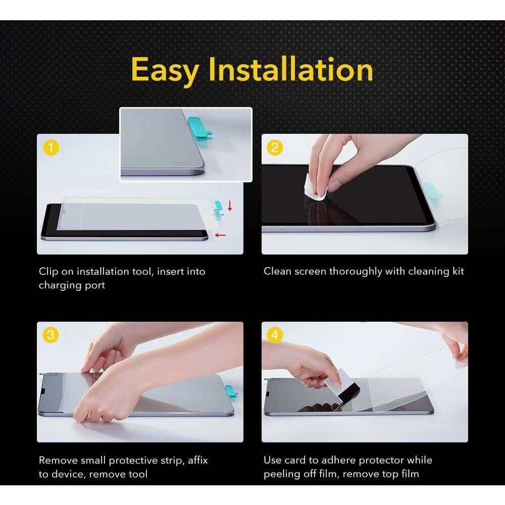 В комплекта: - 1 x ESR Paper Feel Screen Protector - 1 х мокра кърпичка - 1 x суха кърпичка - 1 х антистатична лепенка за премахване на прашинки