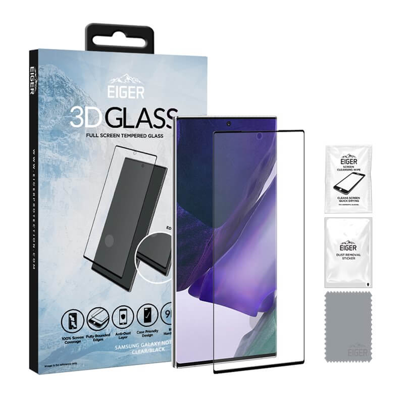 Съвместимост: Samsung Galaxy Note 20 Ultra - 1 х Eiger 3D Glass Full Screen Case Friendly Curved Tempered Glass - 1 x микрофибърна кърпичка - 1 х мокра кърпичка - 1 х антистатична лепенка за премахване на прашинки