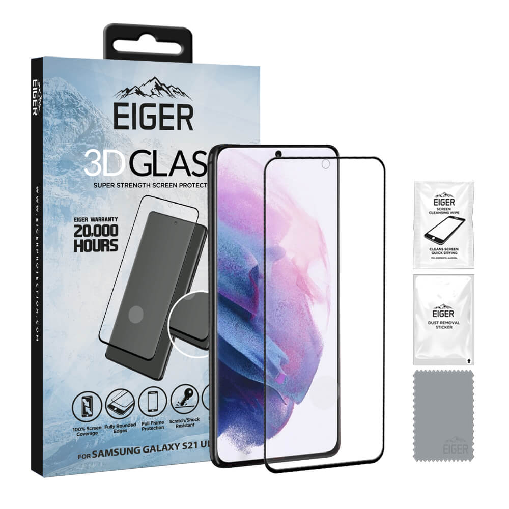Пълен достъп до екрана и камерата, както и до всички бутони, входове и изходи на устройството - 1 х Eiger 3D Glass Full Screen Tempered Glass - 1 x микрофибърна кърпичка - 1 х мокра кърпичка - 1 х антистатична лепенка за премахване на прашинки
