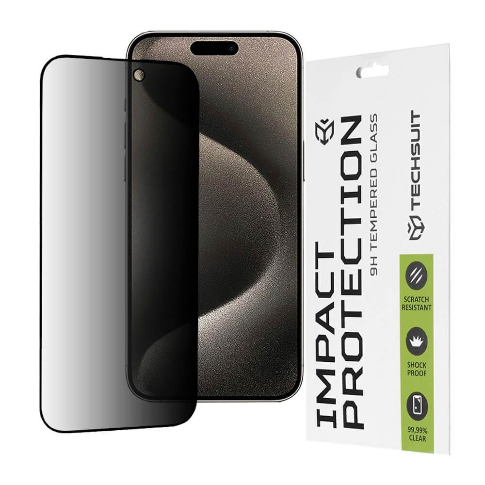Калено стъклено защитно покритие с определен ъгъл на виждане на iPhone 16 Plus, iPhone 15 Pro Max - Techsuit Privacy Full Glue Tempered Glass 111D (черен-прозрачен)