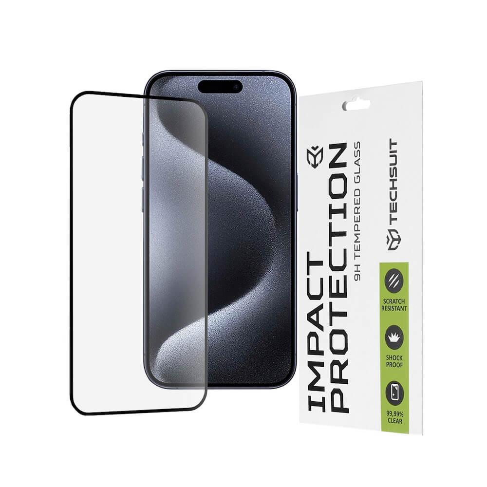 Калено стъклено защитно покритие за дисплея на iPhone 16, iPhone 15 Pro - Techsuit Full Glue Tempered Glass 111D (черен-прозрачен)