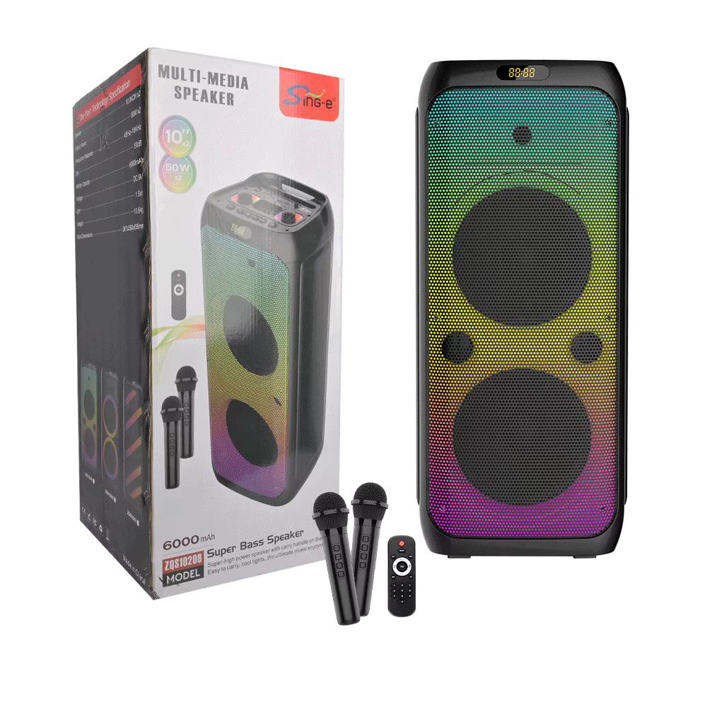 <h3 data-start=\"150\" data-end=\"217\">Портативна караоке тонколона Sing-E ZQS10208 с RGB осветление</h3>\n<p data-start=\"219\" data-end=\"456\"><strong data-start=\"219\" data-end=\"238\">Sing-E ZQS10208</strong> е мощна безжична тонколона с двойни 10-инчови говорители, създадена за истинско парти изживяване. С мощност <strong data-start=\"347\" data-end=\"354\">50W</strong>, впечатляващ бас и цветно <strong data-start=\"381\" data-end=\"403\">RGB LED осветление</strong>, тя съчетава висококачествен звук и ефектна визия.</p>\n\n<h4 data-start=\"458\" data-end=\"488\">Основни характеристики:</h4>\n<ul data-start=\"489\" data-end=\"1007\">\n \t<li data-start=\"489\" data-end=\"530\">\n<p data-start=\"491\" data-end=\"530\"><strong data-start=\"491\" data-end=\"503\">Мощност:</strong> 50W за силен и чист звук</p>\n</li>\n \t<li data-start=\"531\" data-end=\"591\">\n<p data-start=\"533\" data-end=\"591\"><strong data-start=\"533\" data-end=\"548\">Говорители:</strong> 2 х 10\" за дълбок бас и кристални високи</p>\n</li>\n \t<li data-start=\"592\" data-end=\"652\">\n<p data-start=\"594\" data-end=\"652\"><strong data-start=\"594\" data-end=\"609\">Свързаност:</strong> Bluetooth, USB, TF карта, AUX и FM радио</p>\n</li>\n \t<li data-start=\"653\" data-end=\"729\">\n<p data-start=\"655\" data-end=\"729\"><strong data-start=\"655\" data-end=\"675\">Караоке функция:</strong> Вграден микрофон + 2 безжични микрофона в комплекта</p>\n</li>\n \t<li data-start=\"730\" data-end=\"793\">\n<p data-start=\"732\" data-end=\"793\"><strong data-start=\"732\" data-end=\"751\">LED осветление:</strong> RGB светлини, синхронизирани с музиката</p>\n</li>\n \t<li data-start=\"794\" data-end=\"854\">\n<p data-start=\"796\" data-end=\"854\"><strong data-start=\"796\" data-end=\"811\">Управление:</strong> Дистанционно управление за лесен контрол</p>\n</li>\n \t<li data-start=\"855\" data-end=\"931\">\n<p data-start=\"857\" data-end=\"931\"><strong data-start=\"857\" data-end=\"869\">Батерия:</strong> Дълготрайна презареждаема батерия за продължителна употреба</p>\n</li>\n \t<li data-start=\"932\" data-end=\"1007\">\n<p data-start=\"934\" data-end=\"1007\"><strong data-start=\"934\" data-end=\"950\">Преносимост:</strong> Лек и удобен дизайн, подходящ за дома и външни събития</p>\n</li>\n</ul>