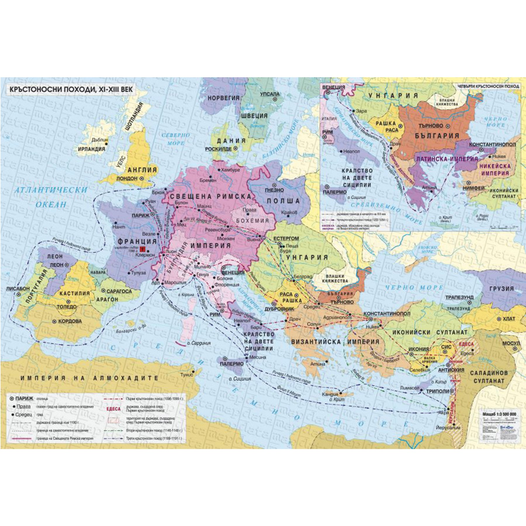 • Съдържа: географска мрежа; държави, представени чрез държавни граници и фоново оцветяване; държави създадени след I-ви кръстоносен поход; граници на самостоятелни владения; граница на Свещената римска империя; I-ви, II-ри и III-ти кръстоносен поход с предводители; хидрография; столици, главни градове на самостоятелни владения и др. градове; надписи на хидрография, държави, историко-географски области и други.
