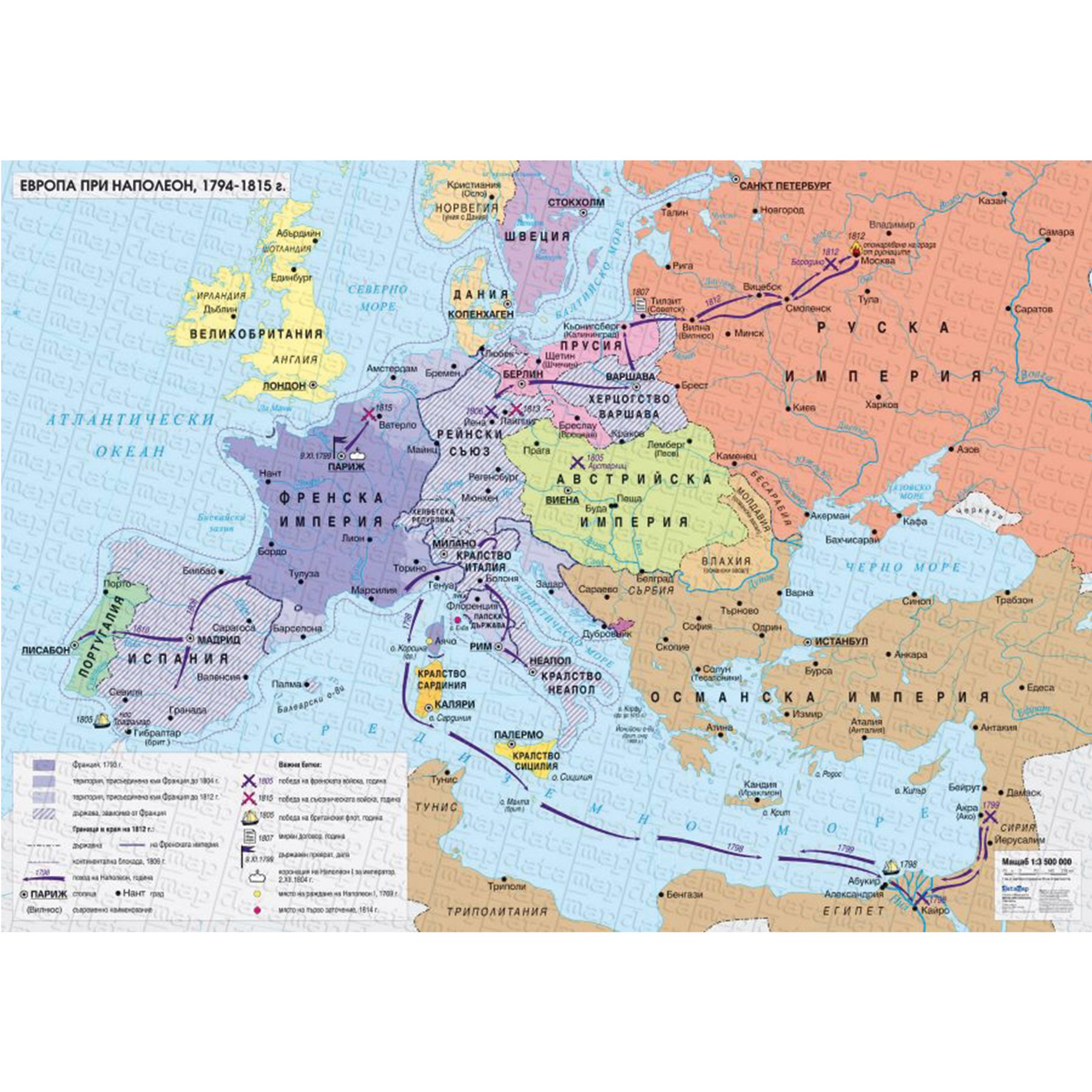 Карта Европа при Наполеон, изобразяваща географска мрежа; държави, представени чрез фоново оцветяване; държави, зависими от Франция, представени чрез щриховка; територия, присъединена към Франция в периода 1793-1812 г.; държавни граници и граница на Френската империя в края на 1812 г.; походи на Наполеон; място на раждане, коронация и заточение на Наполеон; държавен преврат от 1799 г.; опожаряване на Москва; мирен договор от 1807 г.; важни битки; столици и градове; хидрография и надписи на хидрография, държави, историко-географски области, острови и други.