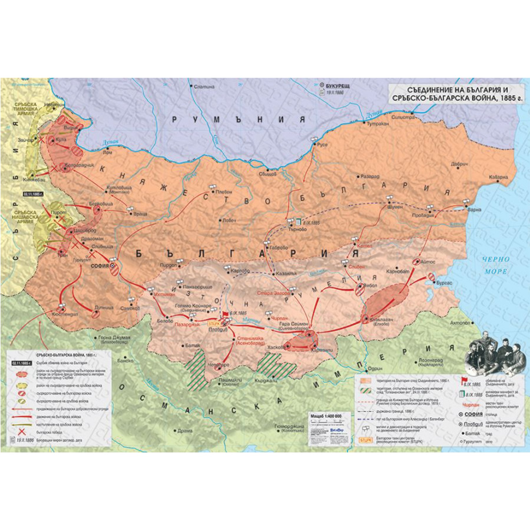 Карта Съединение и Сръбско-българска война, изобразяваща географска мрежа; хидрография; територия на България след Съединението и територии на съседни държави, представени чрез фоново оцветяване върху сенкорелеф; територия, отстъпена на Османската империя според „Топханенския акт“, представена чрез щриховка; райони на съсредоточаване на българска и сръбска войска; държавни граници; граница на Княжество България и Източна Румелия според Берлинския договор; път на българския княз Александър I Батенберг; военни действия; сражения; митинги и демонстрации в подкрепа на движението за съединение; столици и градове; местни тайни революционни комитети; важни дати; надписи на хидрография, държави и други.
