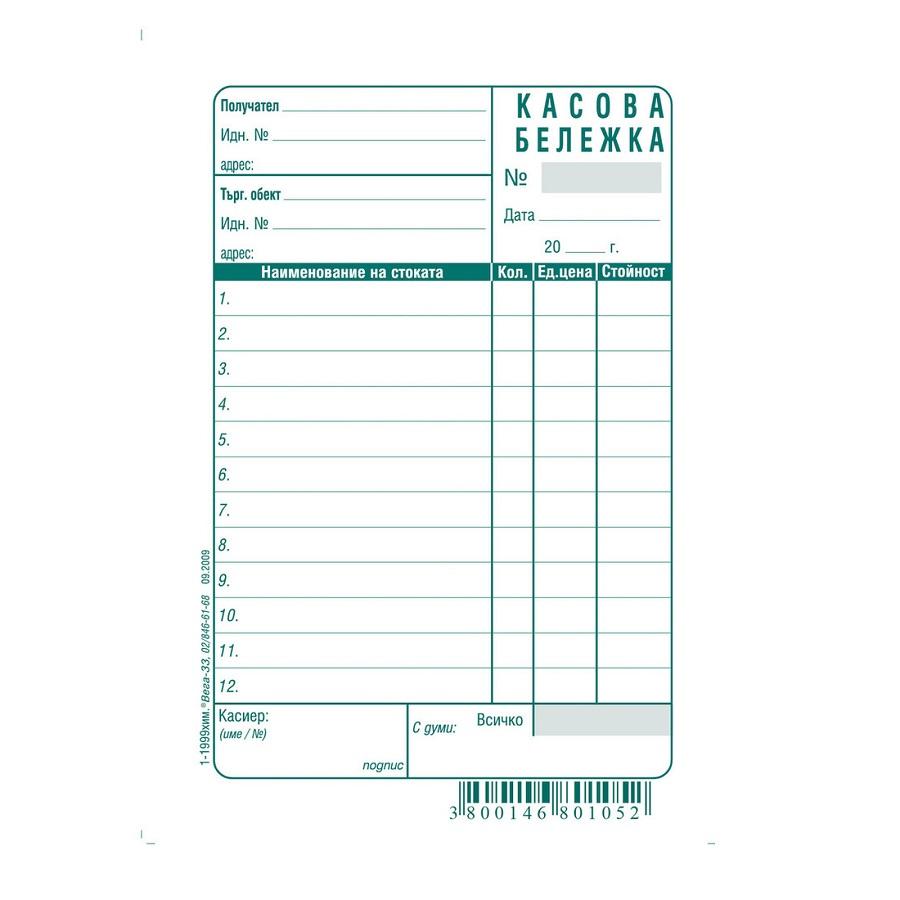 Касова бележка (голяма) блок 1-1999с, химизирана хартия, 100 л.