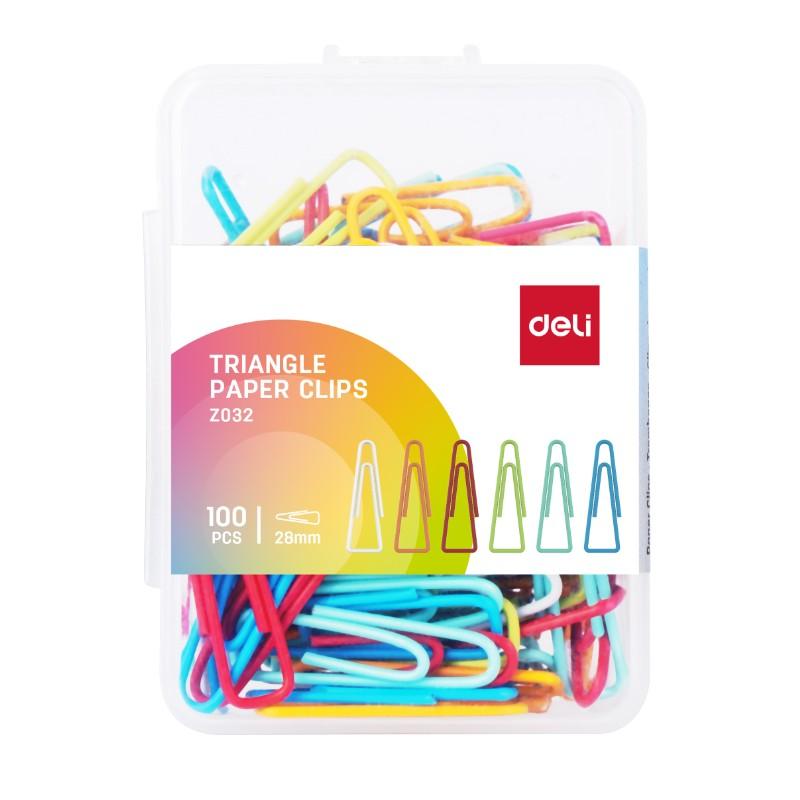 Кламери Deli 28 мм, EZ032, цветни, триъгълни, метал+PVC, кутия 100 бр.