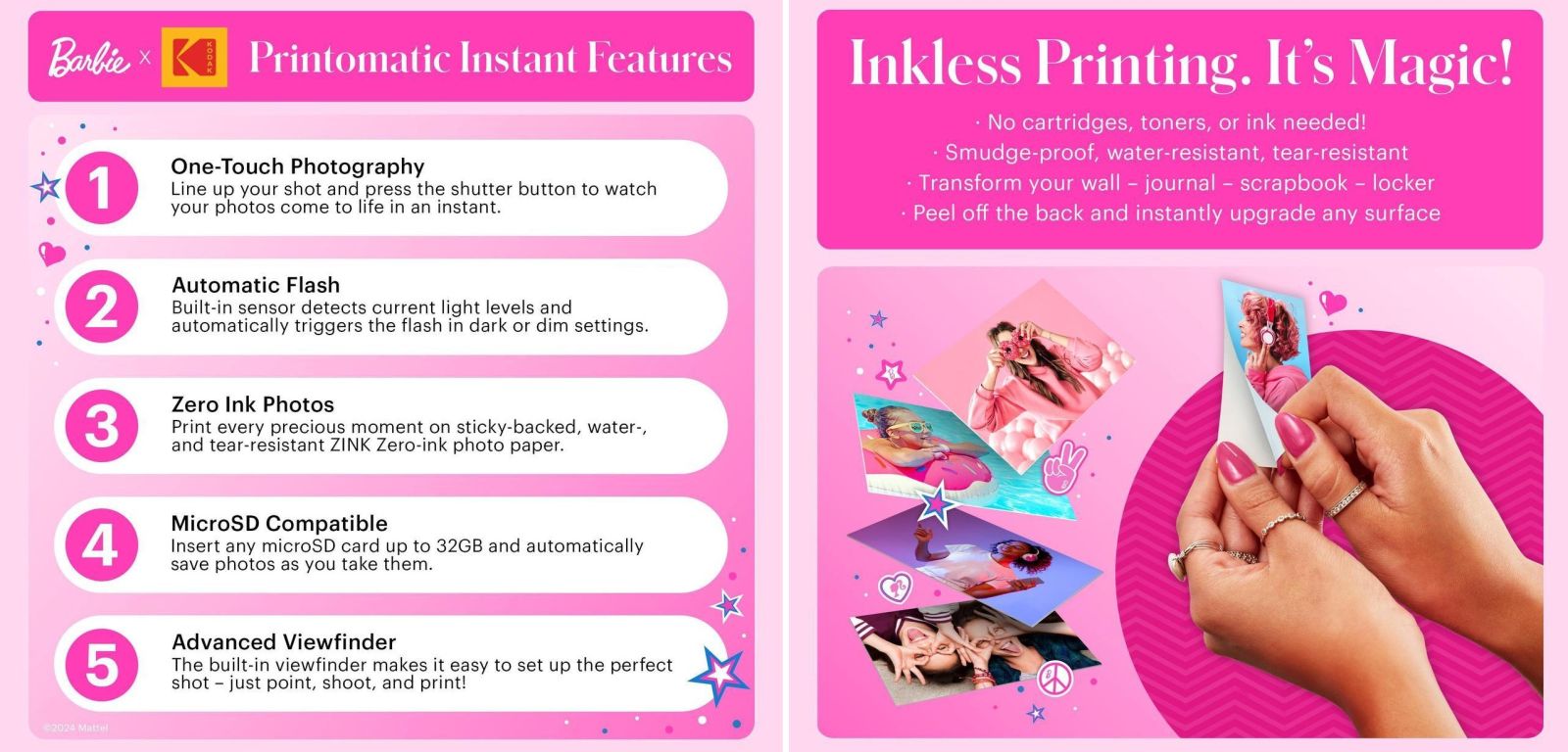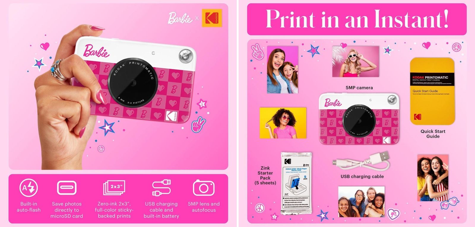 Kodak Printomatic Barbie e страхотен емблематичен моментен фотоапарат, който е идеален за заснемане на вашите забавни моменти и улавяне на важни споменти, където и да сте. Снимайте и отпечатвайте с едно устройство, като разпечатките са устойчиви на размазване, вода и разкъсване. Пъхнете това джобно Barbi бижу в чантата си и създавайте спомени в движение.