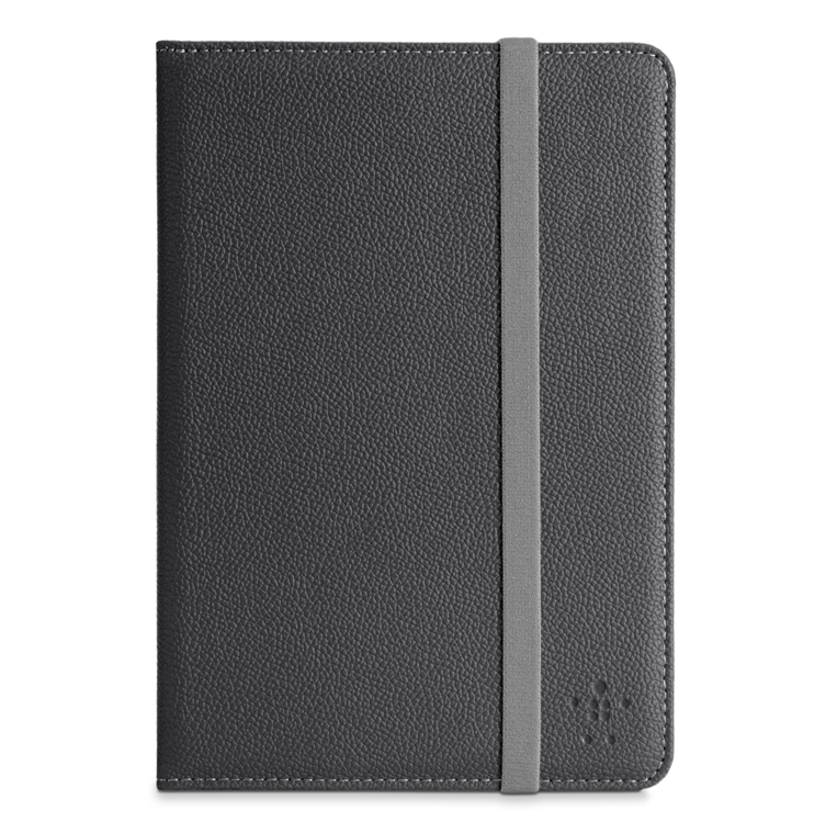 Екстериор от черна еко кожа, комбинирана със сива ластична закрепваща лента, която предпазва калъфа от отваряне