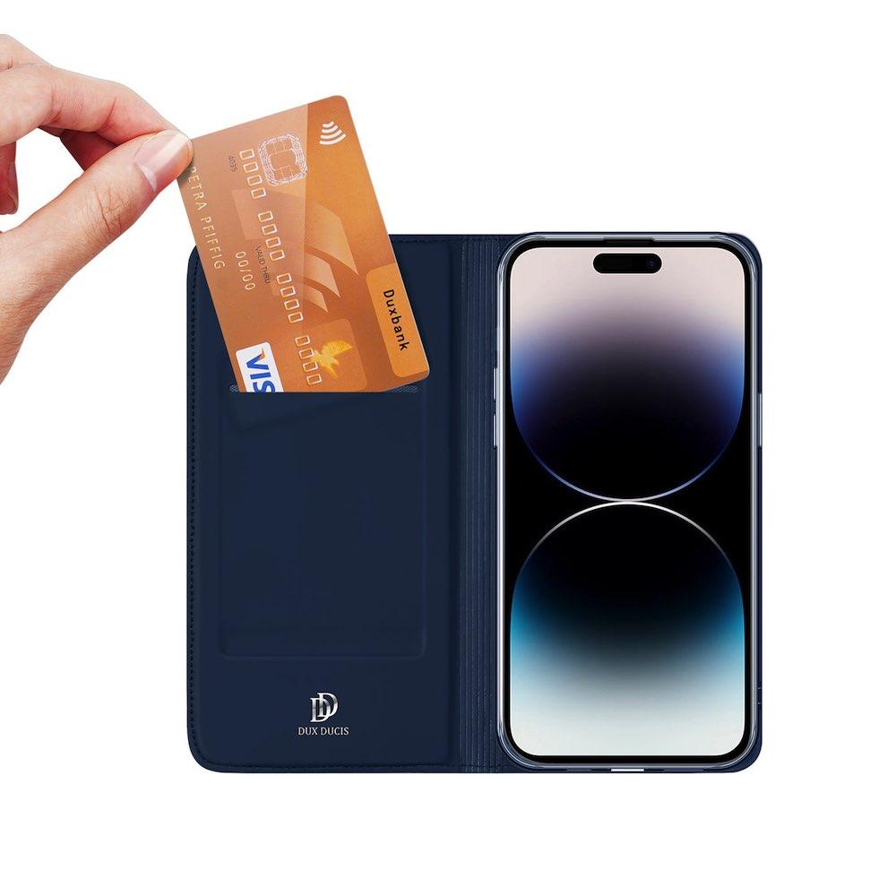 Кожен калъф с поставка и отделение за кр. карти за iPhone 15 Pro - Dux Ducis Skin Pro Case (тъмнисин)