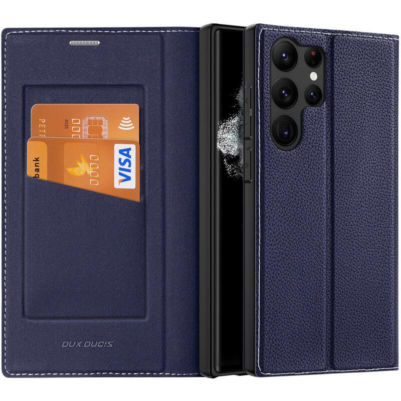 Кожен калъф с поставка и отделение за кр. карти за Samsung Galaxy S23 Ultra - Dux Ducis Skin X2 Case (син)