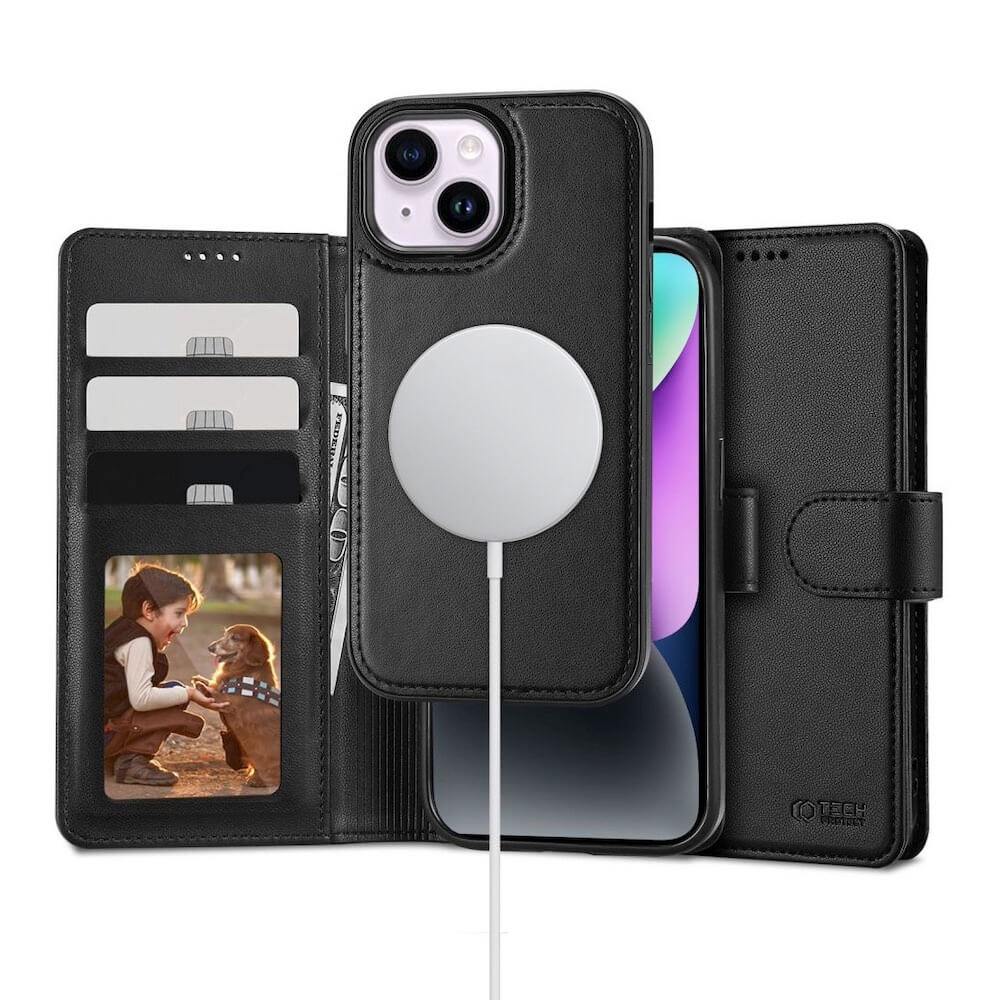 Кожен калъф, тип портфейл с отделящ се кейс с MagSafe за iPhone 14 - Tech-Protect Wallet Leather MagSafe Flip Case (черен)