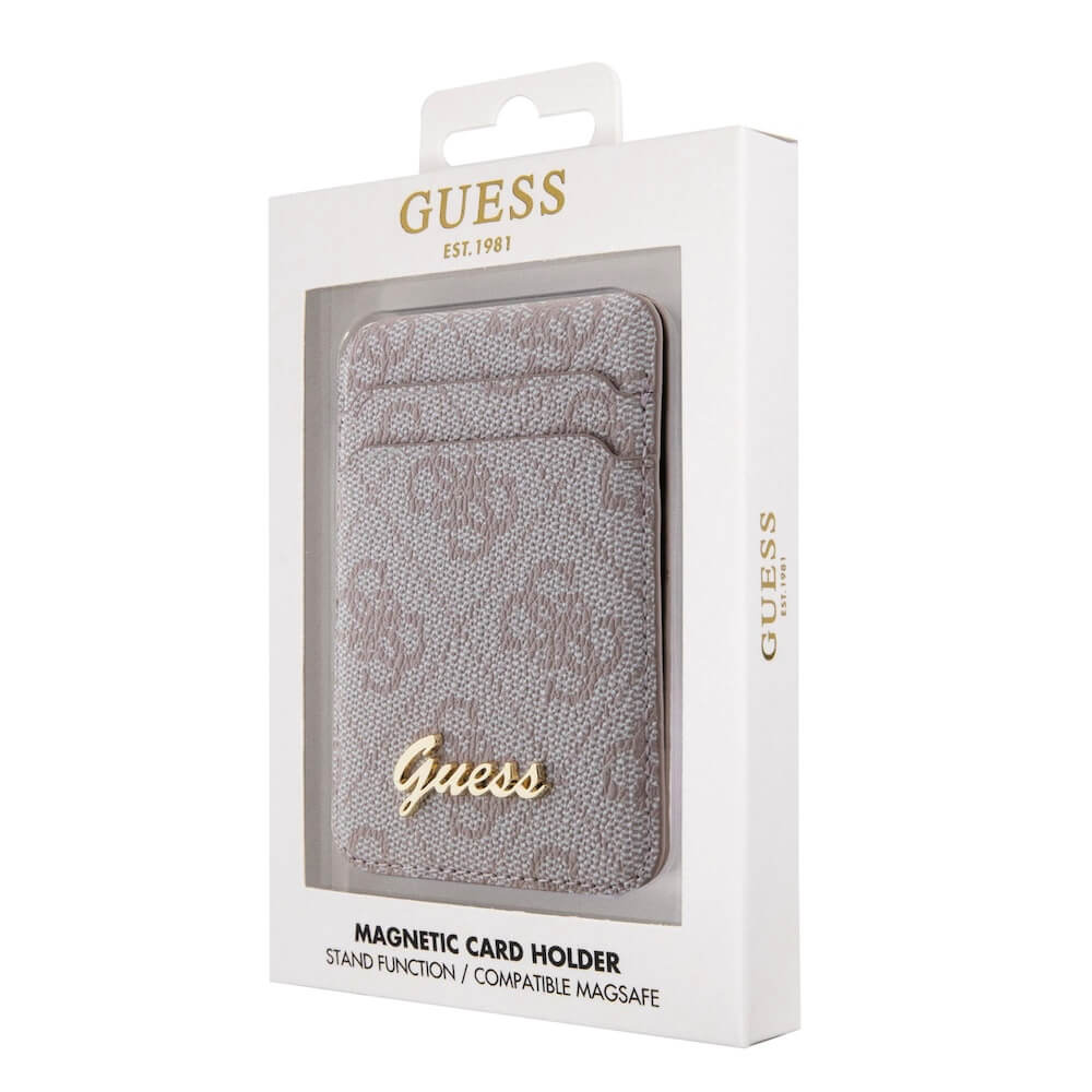 Кожен портфейл (джоб) с вградена поставка за прикрепяне към iPhone с MagSafe - Guess 4G Metal Script Magnetic Cardslot Wallet (розов)
