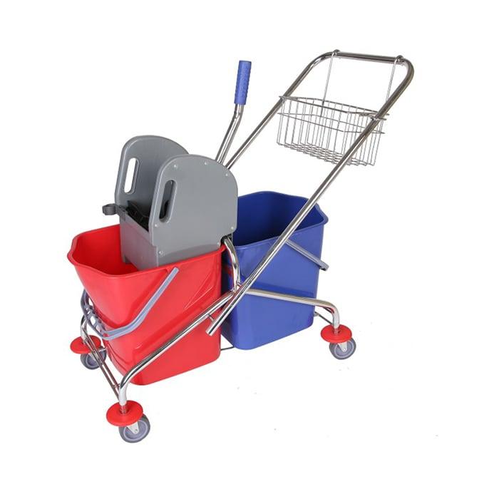 • Количка за почистване с алуминиева рамка и две кофи с общ обем от 46 литра (по 23 литра всяка ). Разполага с преса за изстискване и четири колела, за лесно и удобно местене.