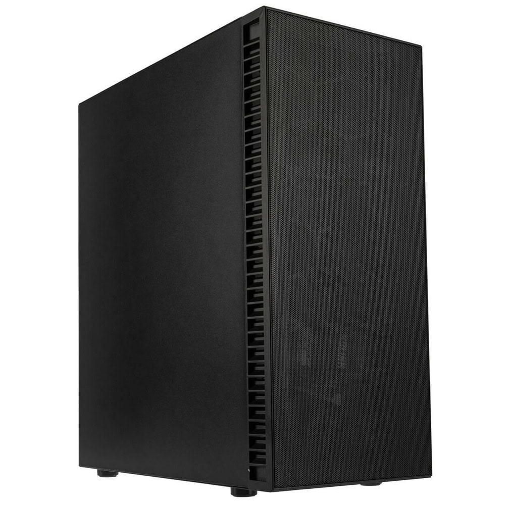 The mesh front panel not only enhances the overall look of the case but also ensures excellent ventilation. The right side panel is crafted from flat metal, maintaining a sleek and streamlined appearance.