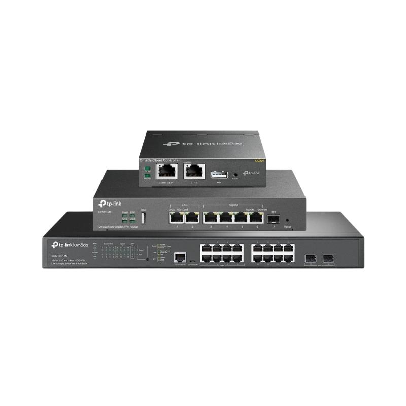 Комплект устройства на Omada - ER707-M2, SG3210XHP-M2, OC200 ER707-M2 - ER707-M2 е Multi-Gigabit VPN Gateway с два 2.5 Gbps порта, четири Gigabit WAN/LAN, един Gigabit SFP и USB 2.0 за LTE бекъп, позволяващ до 6 едновременни WAN връзки с Load Balancing. Осигурява до 500 000 сесии, NAT производителност над 2.3 Gbps и VPN скорости до 650 Mbps (IPSec) и 343 Mbps (WireGuard) SG3210XHP-M2 - SG3210XHP-M2 е 10-портов L2+ управляем PoE switch, създаден за захранване и агрегация на модерни Wi-Fi-6 инсталации: разполага с 8× multi-gig 2.5 Gbps RJ-45 PoE+ порта и 2× 10 Gbps SFP+ uplink слота, с общ PoE бюджет 240 W. Устройството осигурява висока пропускателна способност (80 Gbps switching capacity, 59.52 Mpps forwarding), таблица за MAC до 16K и 12 Mbit пакетен буфер, поддържа пълен набор L2/L2+ функции (VLAN, LACP, STP/RSTP/MSTP, IGMP snooping) и статично L3 маршрутизиране. OC200 - Централизирано управление: До 100 Omada точки за достъп, 20 JetStream комутатора и 10 Omada рутера, Безплатен облачен достъп: Управлявайте и наблюдавайте с приложението Omada или уеб потребителския интерфейс отвсякъде и по всяко време. Гъвкави възможности за захранване: 802.3af/at PoE или Micro USB (DC 5V/минимум 1A)