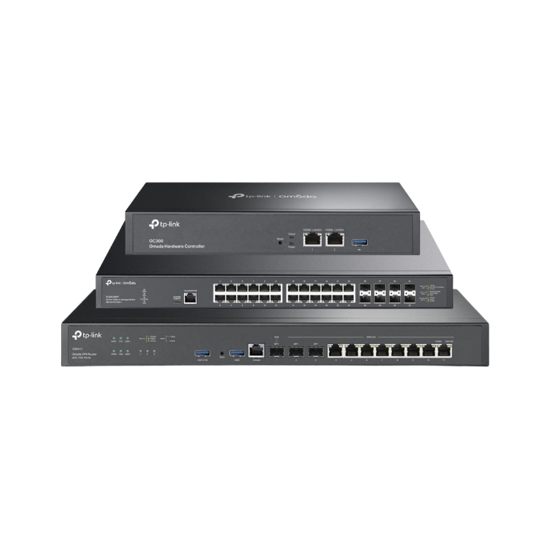 Комплект устройства на Omada - ER8411, SX3832MPP, OC300 ER8411 - Високопроизводителен VPN рутер, оборудван с 10G портове. 10G свързаност: ER8411 разполага с два 10G SFP+ порта (един WAN и един WAN/LAN). Мощен хардуер: С четириядрен процесор на 2,2 GHz, рутерът е способен да обработва големи обеми данни. Множество VPN протоколи: Поддържа различни VPN протоколи като SSL, IPSec, PPTP и L2TP в режими клиент/сървър. Централизирано управление: Интегрира се безпроблемно с Omada SDN платформата. SX3832MPP - SX3832MPP е 32-портов L2+ управляем комутатор, който комбинира 24× multi-gig 1/2.5/5/10 Gbps RJ-45 PoE++ порта и 8× 10 Gbps SFP+ слота — идеален за захранване на Wi-Fi 6/7 точки и мощни PoE устройства. Устройството предлага 770 W общ PoE бюджет (до 90 W на порт), много висока комутационна мощност 640 Gbps и 240 Mpps forwarding rate, с голяма MAC таблица (≈32K) и 24 Mbit пакетен буфер за гладък трафик при натоварване. Поддържа L2+/L3 функции (VLAN 4K, ACL, QoS, Static Routing, ERPS), OAM/DDM OC300 - Хардуерен контролер, предназначен за централизирано управление на мрежови устройства като точки за достъп, комутатори и шлюзове в рамките на Omada SDN платформата. Централизирано управление: OC300 позволява управление на до 500 точки за достъп Omada, до 100 комутатора JetStream и до 100 рутера Omada, обслужвайки до 15 000 клиенти. Облачен достъп: контролерът предоставя възможност за отдалечено управление на мрежата от всяко място и по всяко време. Интерфейси: 2× 10/100/1000 Mbps Ethernet порта / 1× USB 3.0 порт. Захранване: 100–240 V~50/60 Hz, 0.6 A. Размери: 294 × 180 × 44 мм. Сертификация: CE, FCC, RoHS.