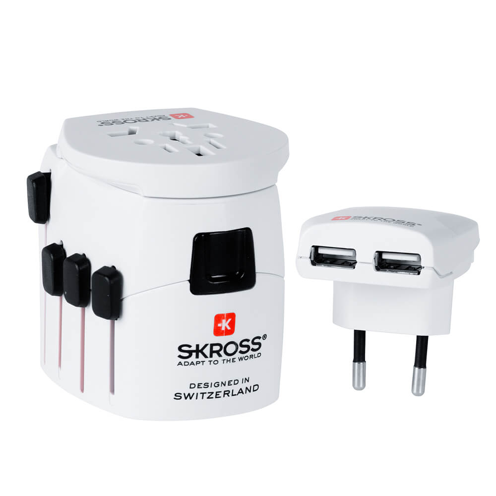 В комплекта: - Skross Travel Adapter World Pro преходник - Skross USB Charger Euro захранване с 2 изхода