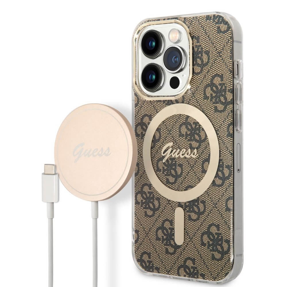 Комплект хибриден удароустойчив кейс с MagSafe и поставка (пад) за безжично зареждане за iPhone 14 Pro Max - Guess 4G Printed Stripe MagSafe Case With MagSafe Wireless Charger Set (кафяв)