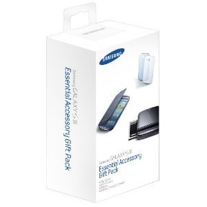 Samsung Essential Kit - комплект оригинални кожен Flip Cover калъф (тъмносин), 2 силиконови калъфа (бял и син), захранваща док станция и резервна оригинална батерия за Galaxy S3