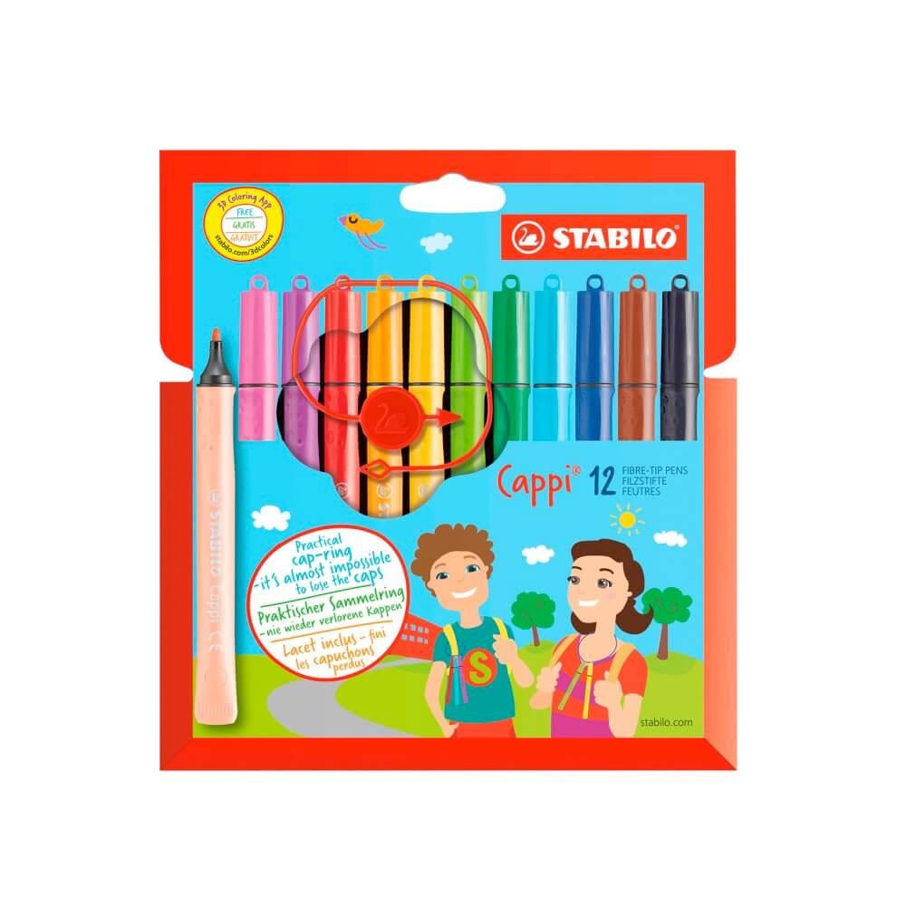 Комплект маркери за рисуване - Stabilo Cappi Fibre-Tip Pen with Cap-Ring Assorted Colours + 1 Cap-Ring (12 броя)