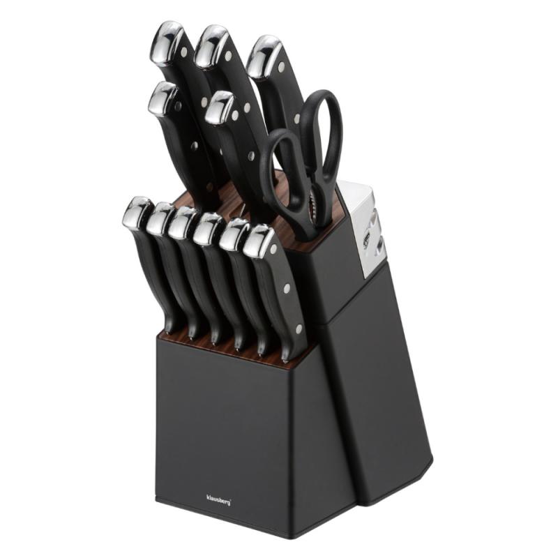 - Брой елементи: 13 (5 кухненски ножа + 6 пържолни ножа + ножица + стойка)