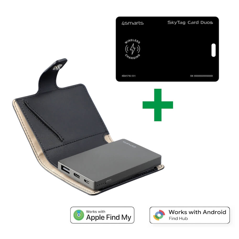 Комплект портфейл с външна батерия, устройство за намиране на вещи, мултифункционален инструмент - 4smarts PowrWallet Set SkyTag Duos ReCharge Card Location Finder (черен)