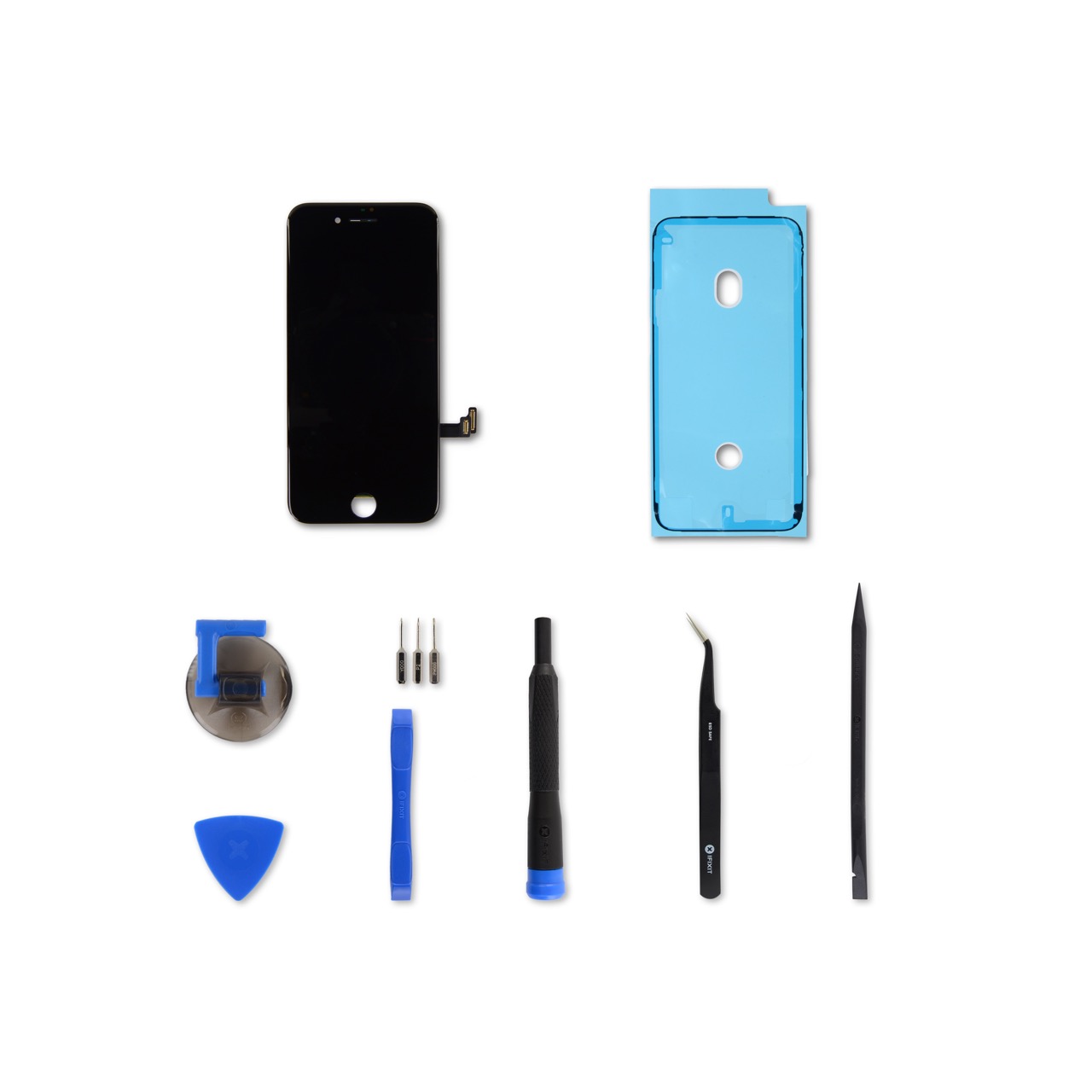 Съдържание на комплекта: - iPhone 8 LCD екран и дигитайзер (пълен комплект) - iPhone 8 рамка - iFixit Opening Pick - Spudger - Ъглови пинсети - Precision Bit Driver - 4 mm Precision Bits: - Phillips #000 - Pentalobe P2 - Tri-point Y000