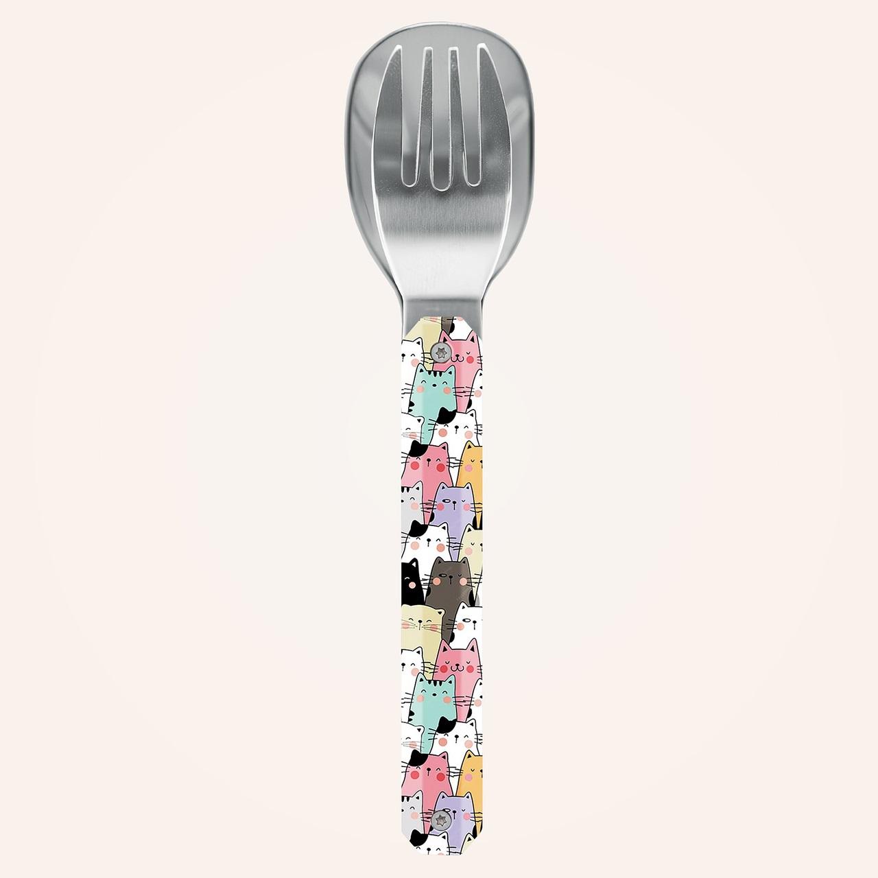 Прибори за хранене от мартензитна неръждаема стомана 2CR14, полирано огледално покритие. Състои се от лъжица и вилица с 4 зъба. Декорирана прозрачна полимерна дръжка. Магнитно сглобяване. Доставя се с твърд калъф за носене от полипропилен (PP). Подходящи за съдомиялна машина.