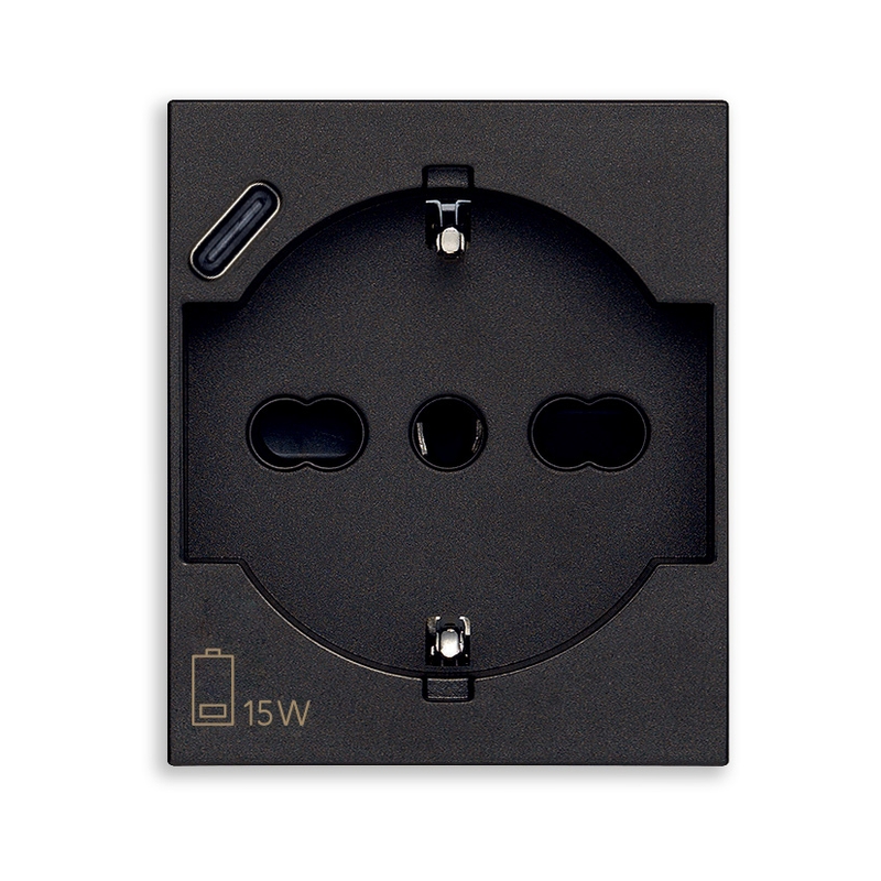 Контакт Шуко/итал. стандарт 2P+E 16A и USB розетка за зареждане тип C 15W 3A 5V 2 модула SICURY защита Black LINEA. С максимална безопасност SICURY защита - патентована технология на Vimar за автоматична механична защита на контактите. Осигурява безопасност чрез синхронен отварящ механизъм, който позволява включване само при правилно поставен щепсел. Предотвратява достъп до тоководещи части и повишава електробезопасността. Удобство, свъзаност, устойчивост - интелигентен избор, който превръща всеки интериор в стилно и модерно пространство.