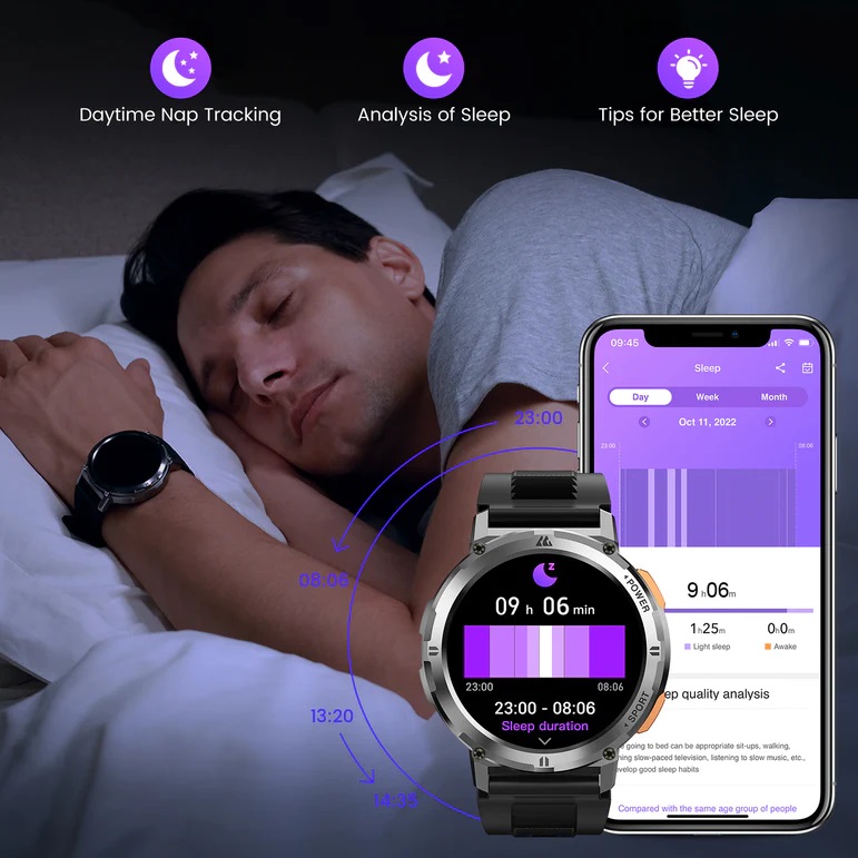 KOSPET TANK T2 проследява и оценява съня ви в различни измерения, като етапи на съня и сърдечен ритъм. Той също така позволява задълбочен анализ на качеството на съня ви с генериране на съответните изчерпателни данни, дори по време на кратки дрямки.