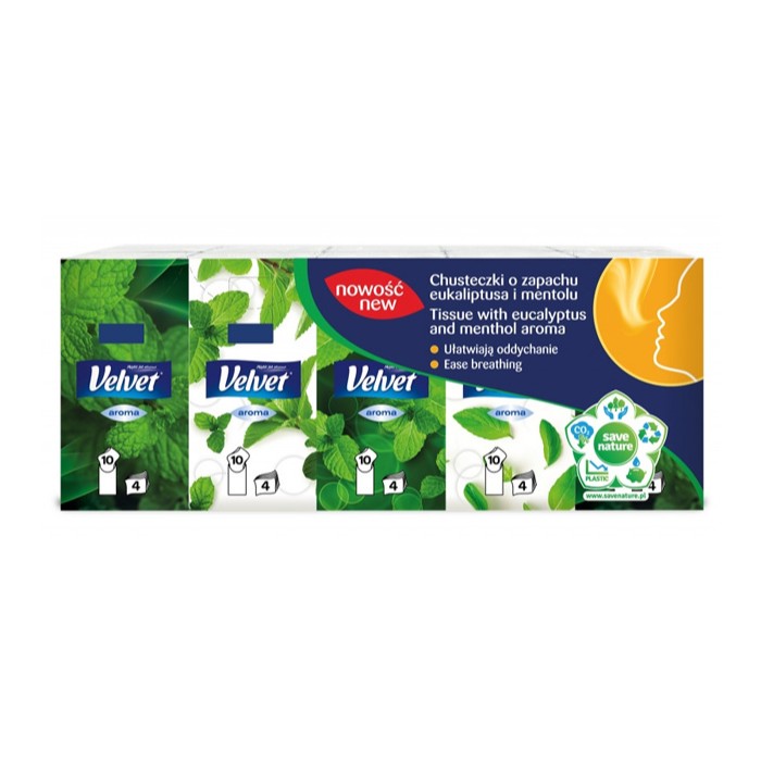 Velvet: Където всяко докосване носи свежест и комфорт!Козметичните кърпи Velvet с евкалипт и ментол са създадени за изключително нежно и освежаващо изживяване при всяко докосване. С четири пласта деликатна, но здрава хартия, тези салфетки осигуряват максимална мекота и здравина, които гарантират надеждност при всяка употреба. Бялата им визия допринася за усещането за чистота и естетика във всеки дом или офис. Добавените аромати на евкалипт и ментол не само освежават, но и създават приятно усещане за прохлада, което е особено ценно при ежедневна грижа за лицето и ръцете. Опаковката от 10 броя ги прави изключително удобни за носене в чанта или кола, както и за употреба по време на пътувания. Изберете Velvet, за да се насладите на хартиени кърпи, които комбинират стил, качество и неустоима свежест във всяка салфетка.