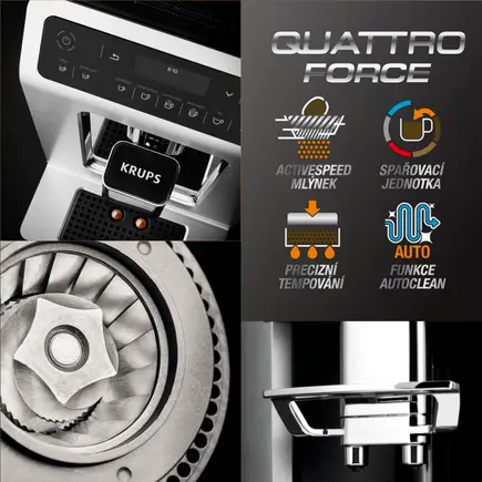 Напреднала технология за перфектно кафе KRUPS Quattro Force оптимизира всяка стъпка от приготвянето на еспресо от зърното до чашата: бързо смилане с 20% икономия на време, ултра-плоско трамбоване, първокласно приготвяне и автоматично оттичане за дълготрайна производителност. | ![]() |