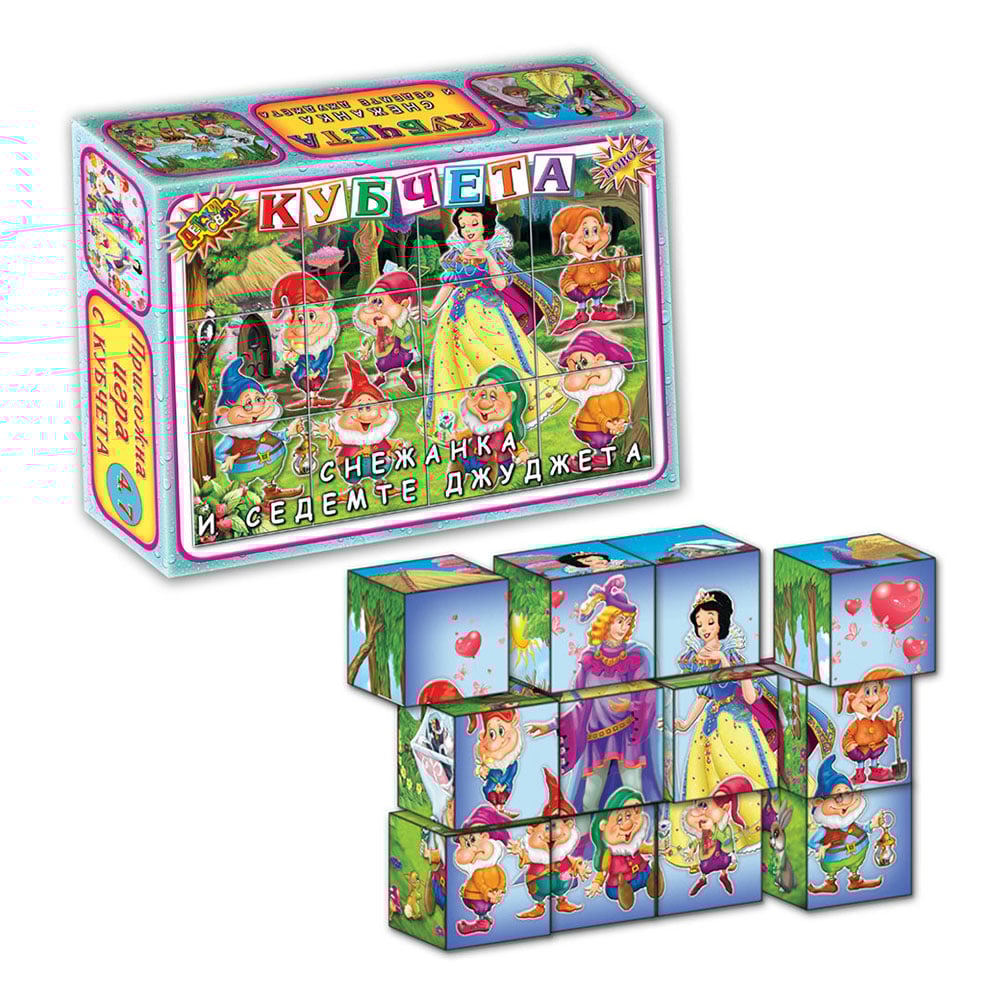 • Комплектът кубчета "Снежанка и седемте джуджета" съдържа 12 броя кубчета с размери 4 x 4 cm.