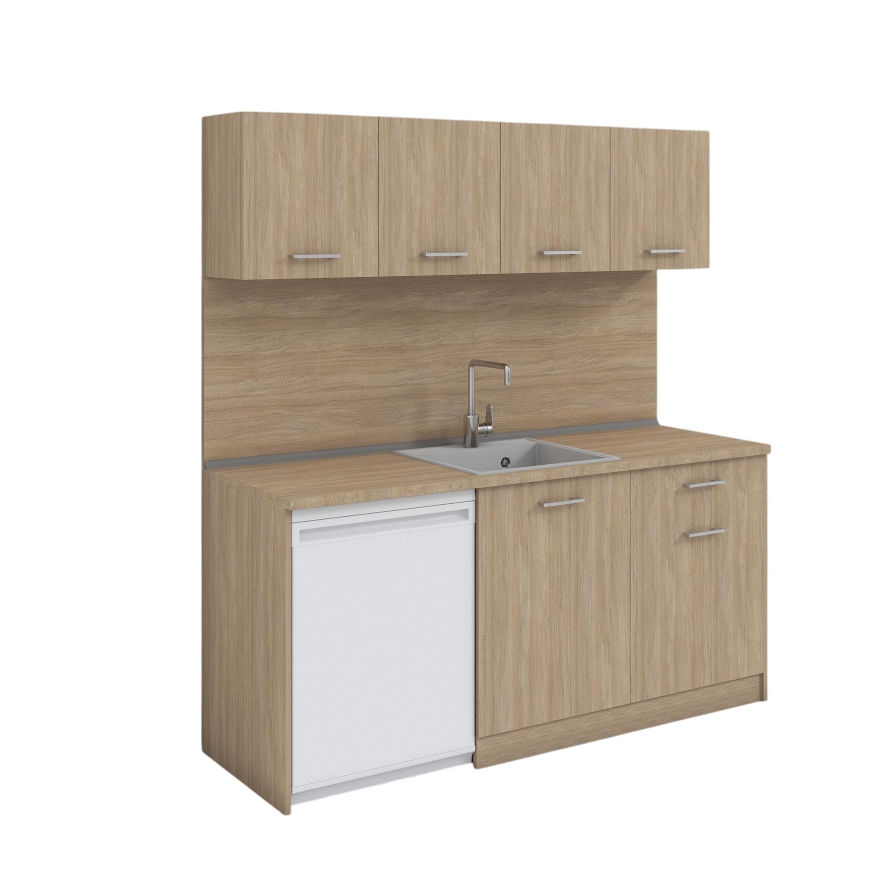 • Долният ред шкафове се състои от ниша за свободно стоящ хладилник, шкаф за мивка и шкаф с чекмедже над него.