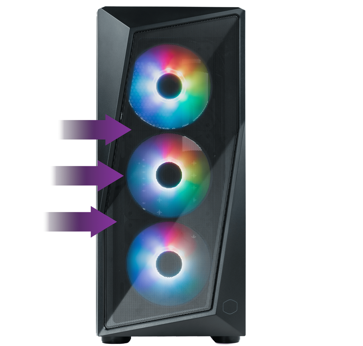Three 120mm ARGB Fans Included Three pre-installed CF120 fans ensure stunning aesthetics, eye-catching design, and thermal excellence. |