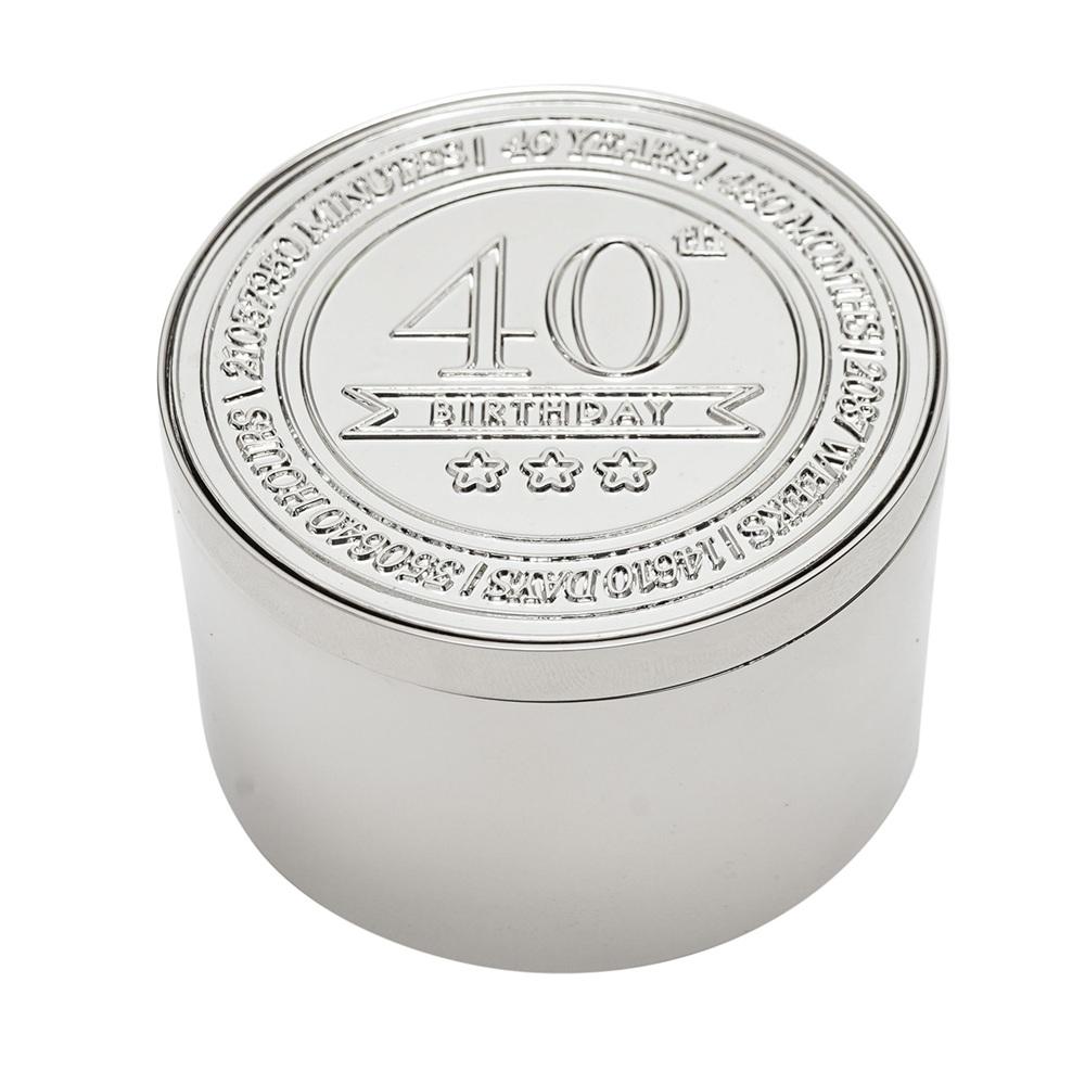 Кръглата кутия за дрънкулки Milestones – 40 е компактен сувенир, предназначен да отбележи важен рожден ден с ясен, показващ възрастта вид.