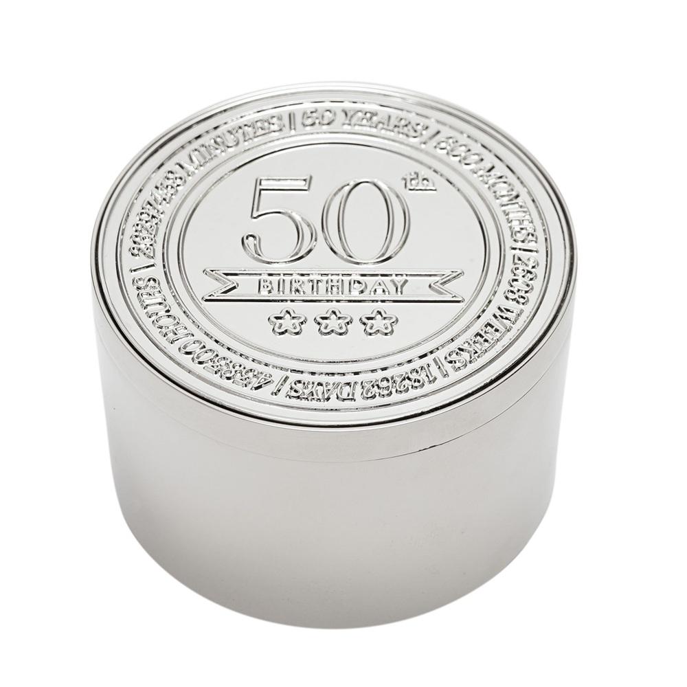 Кръглата кутия за дрънкулки Milestones – 50 е компактен сувенир, предназначен да отбележи важен рожден ден с ясен, показващ възрастта вид.
