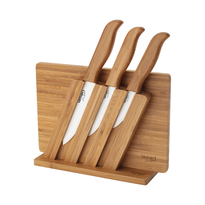Lamart Комплект от 3 ножа, с дървена поставка и дъска за рязане