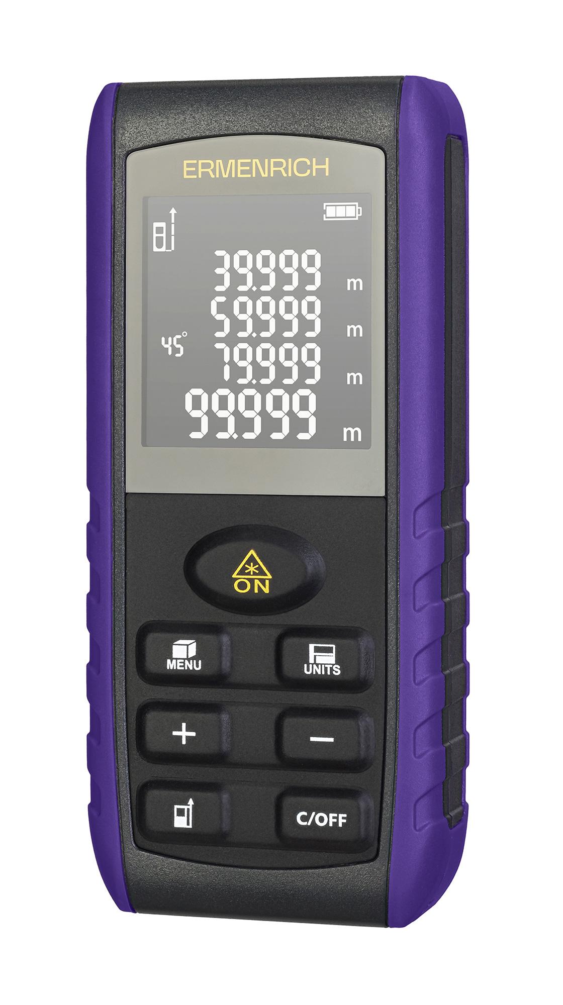 Лазерният измерител Ermenrich Reel PRO GE40 е практичен, многофункционален инструмент за строителни, ремонтни, монтажни и проектно-конструкторски работи. С него могат да се измерва разстояния до 40 метра, както и да се изчисляват площ, обем и ъгли. Когато трябва да се извършват измервания при трудни условия, функцията с използване на Питагоровата теорема ще Ви помогне да изчислите разстоянието с помощта на междинни измервания.