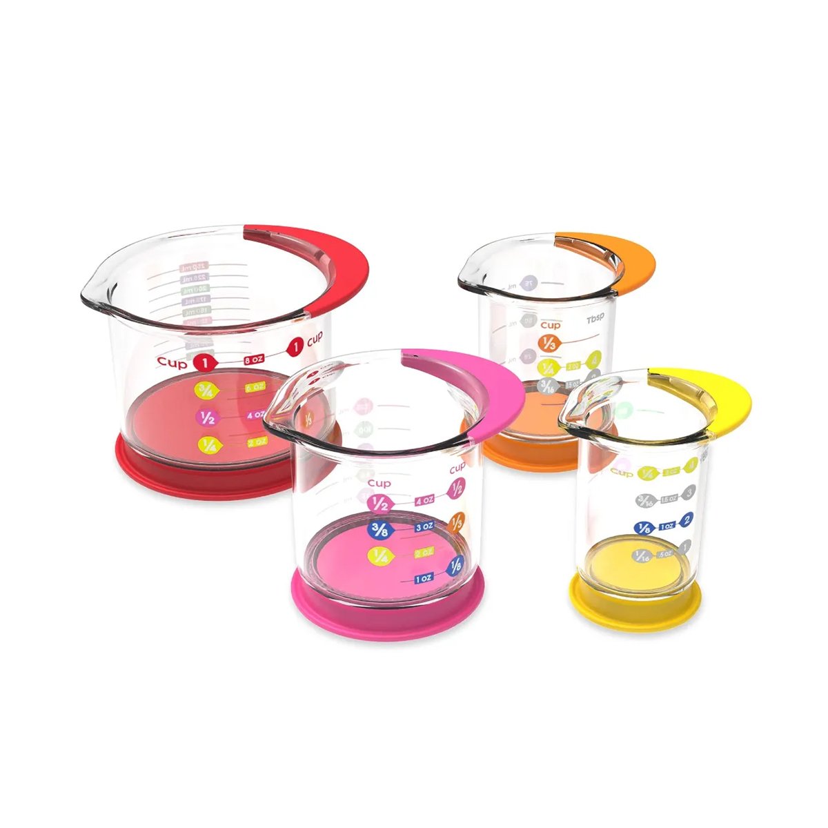 • Този комплект се състои от 4 чаши - има 1 цяла чаша (червена), 1/2 половин чаша (розова), 1/3 трета чаша (оранжева) и 1/4 четвърт чаша (жълта).