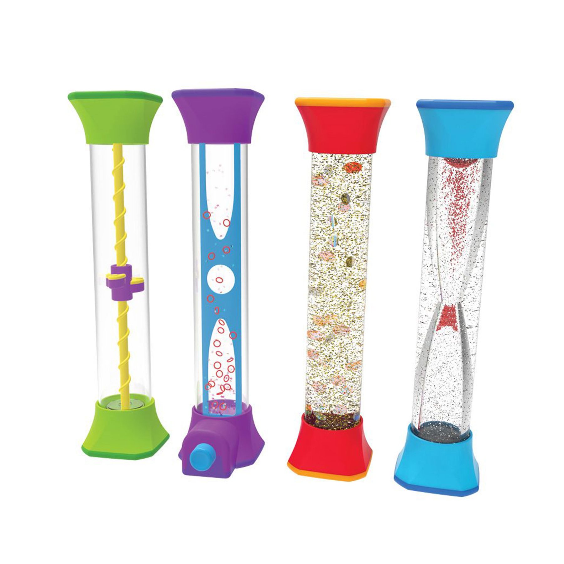 • Комплектът съдържа четири туби, всяка от тях предлага уникално хипнотизиращо движение: успокояващ гравитационен спинер, фантастична неподвижна тръба, успокояваща бляскава тръба и вълшебен пясъчен часовник.