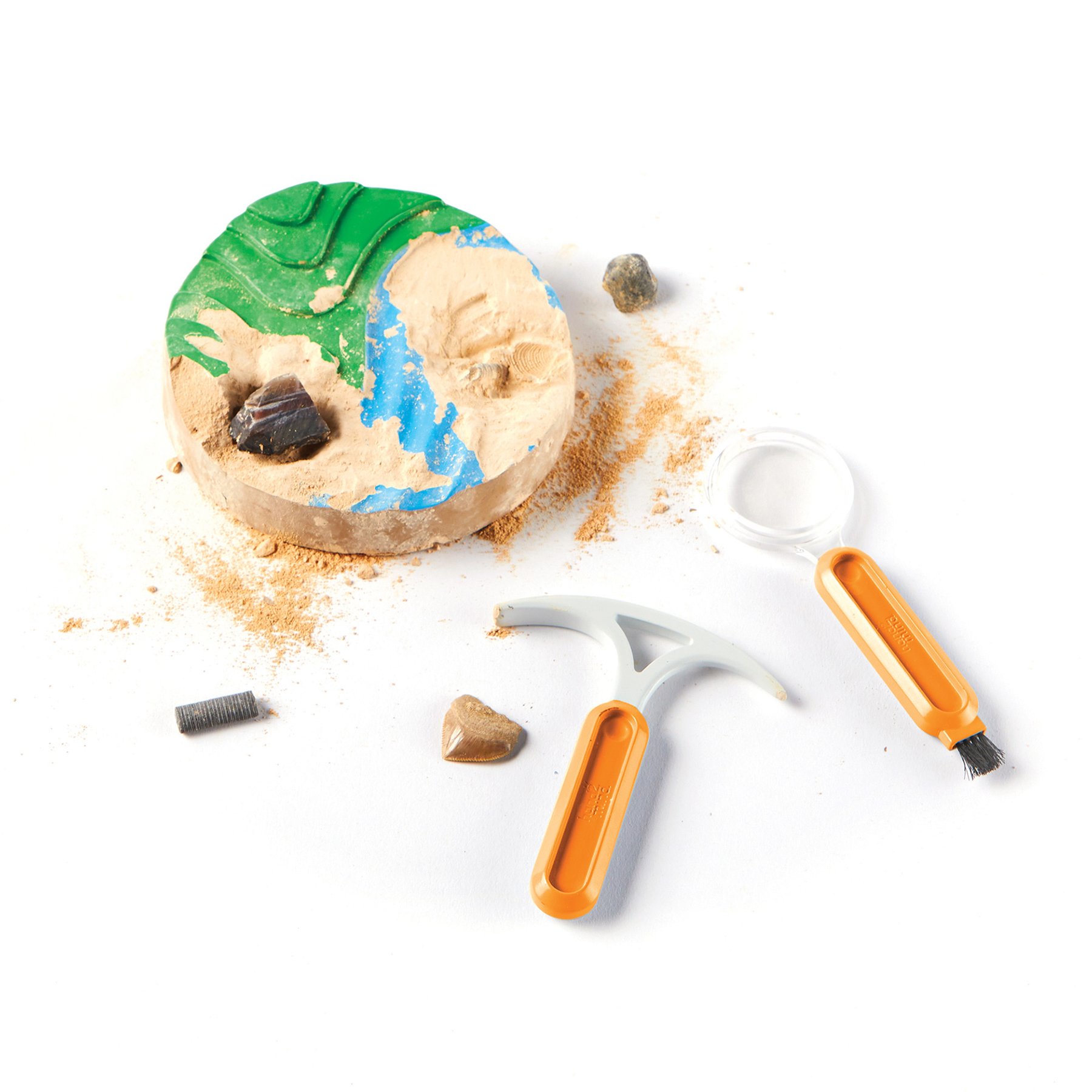 Открий земни и морски вкаменелости в комплекта за изкопаване на вкаменелости за деца! Състои се от 2 инструмента за копаене, за да бъдат намерени цели 8 истински вкаменелости. Научи историята на Земята с ръководството за приключения. Запази опаковката, която ще превърнеш във витрина за своите експонати.