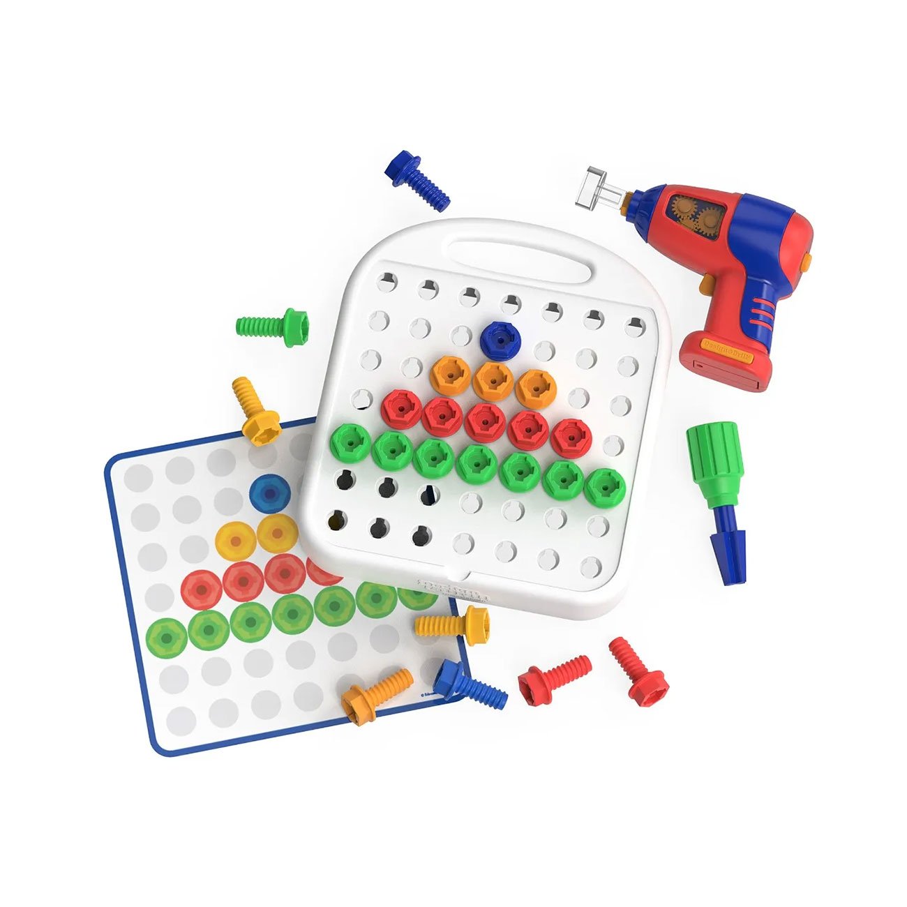 • Комплектът включва дъска за дизайн, моторизирана бормашина с накрайник, мини отвертка с накрайник Phillips, 5 двустранни карти с шаблони и 50 цветни болта.