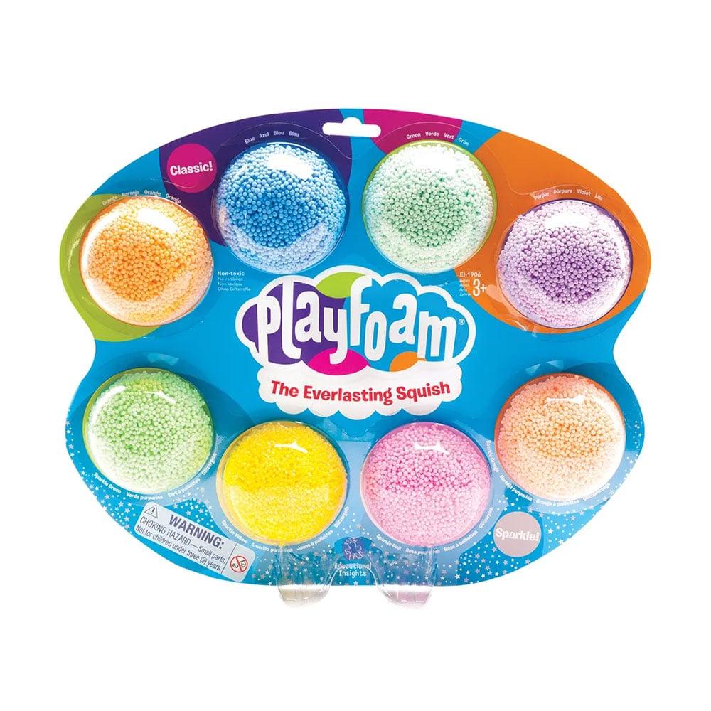 Структурата, наподобяваща мъниста спомага за стимулиране на чувството за допир, а гъвкавата текстура е идеална за развиване на силата на ръцете, фините двигателни умения и координацията между ръцете и очите. Подходящата за деца формула никога не изсъхва и се залепва само за себе си. Цветовете могат да се извайват поотделно или да се смесват, за да се създаде голяма топка мега дъгова топка от пяна.