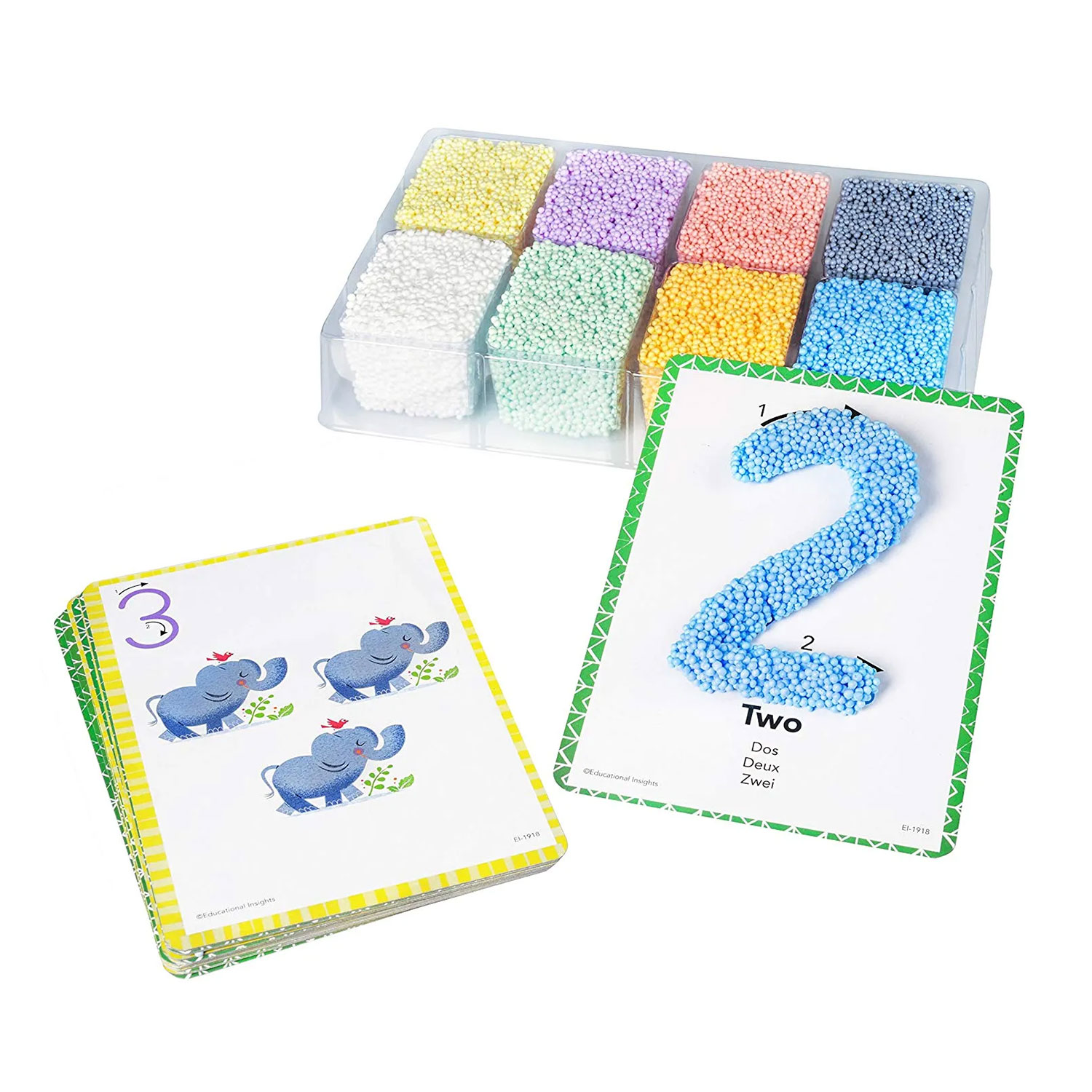 • Този комплект помага на малките деца да усвояват числа и форми по забавен, интерактивен и практически начин. Чрез моделиране и оформяне на меката, еластична пяна директно върху картите с контури, децата развиват фината моторика, сензорното възприятие и ранните математически умения.