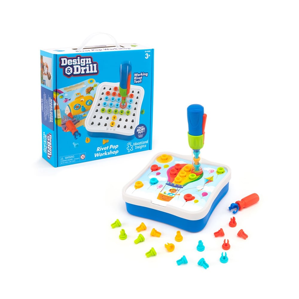 • Малките строители използват ръчно задвижван инструмент за нитове, които „изскачат“, когато бъдат поставени, за да завършат цветните шарки на включените карти с дейности.